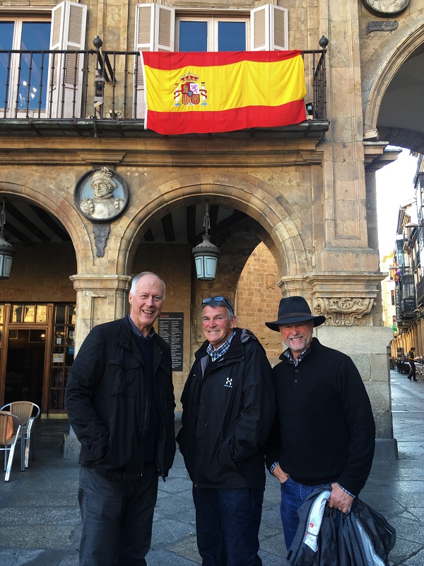 Three Amigos at Plaza Major with Spain Flag
